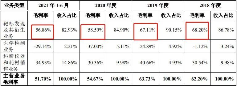然而,靶标发现及其衍生业务的毛利率却持续下降。2018年,该业务收入占主营业务收入比重86.78%,毛利率68.2%。2020年,毛利率跌破60%,为58.59%。2021年1-6月,该业务毛利率进一步下跌至56.86%。
