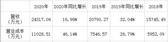 同时,营业成本也在上涨,且增速明显快于营收。2018年至2020年,营业成本分别为5952.09万元、7546.57万元、1.1亿元,2019年同比增长26.79%,略低于营收。但2020年,营业成本同比增长46.14%,远高于营收不到20%的增速。