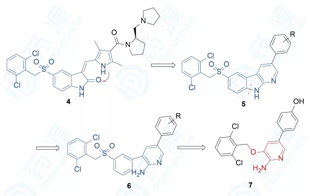 从结合信息可知,二氯苯基为了可与Tyr-1230发生π-π堆积作用,磺酰亚甲基自行进行U-形转折,可能是由于二氯苯基、吲哚酮及吡咯环形成的共轭平面过大,故需缩小其基本骨架。基于骨架跃迁原理,首先将吲哚酮与吡咯的分子内氢键“固化”成共价键,为氮杂吖啶5;随后切断C-N键形成2-氨基-3-苯基吡啶化合物6;最后进一步简化连接基团,得到衍生物7。
