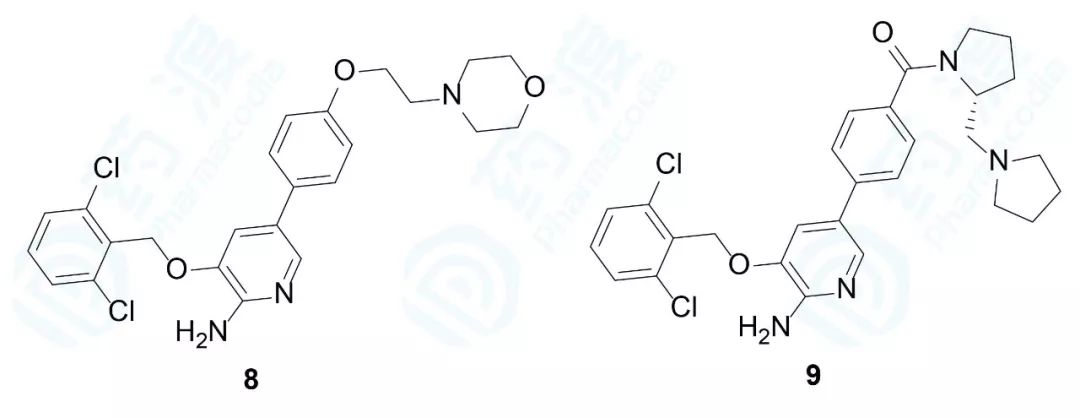 根据复合物的晶体结构,5-苯基结合于Tyr1159、Ile1084和Gly1163构成的疏水性狭窄裂隙,这需要确保在氨基吡啶的5位连接的芳环具有平面性,芳基上连接的基团延伸到溶剂相中。此外,11中的酰胺片段已离开疏水裂隙,进入水相,提示延伸的亲水性片段可不必经酰胺键连接。
