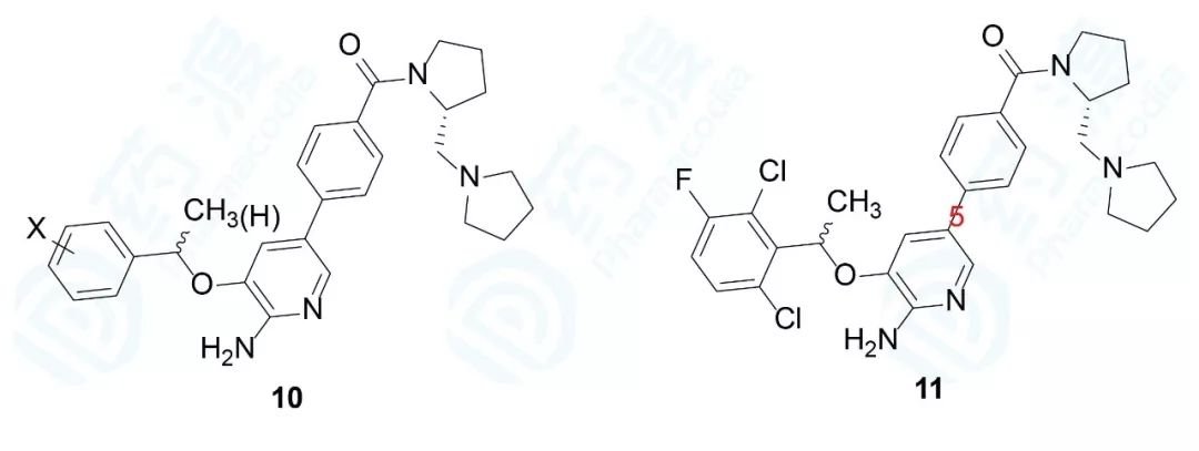 为了考察环上取代基对活性Ki和亲脂性效率LipE的影响,在苯环上引入一个或多个、相同或不同的卤素,连接链或用甲基取代、或不取代,合成了一系列通式10的衍生物,活性测定发现,衍生物11的活性最高,对c-Met酶的活性参数为:Ki=0.012μmol·L-1、LipE=4.82;对c-Met细胞的活性参数为:IC50=0.020μmol·L-1、 LipE=4.60。