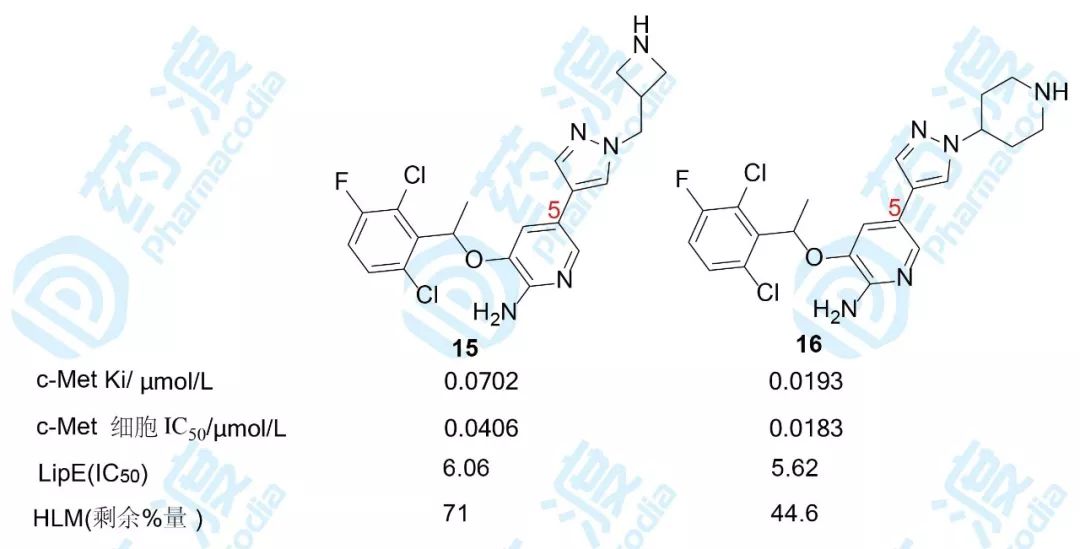 用五元含氮芳环替换5-苯环可增加水溶性,例如含5-吡唑或咪唑化合物的 cLogD比相应的苯化合物低2个单位,并且较小扭角,增加了共面性,有利于结合。氨基吡啶与吡唑环的连接方式对活性影响很大,例如化合物12和13的活性以及 LipE 值相差很大。结构生物学表明,12的吡唑环氮原子所处的位置使得c-Met的残基Met1160和Ile1084取向与吡唑环邻近,不利于氨基吡啶的氢键结合,而且该吡唑环处于酶蛋白的疏水性界面,为了发生疏水-疏水相互作用,N原子的孤电子对的去水合作用是不利的焓变;而13的N原子都进入了水相,没有上述的不利效应,因而活性高12,酶或细胞活性提高了30~40倍。化合物13的N-甲基化后产14的活性更强,提示由这个N原子可引出含有极性基团的碳链,以提高活性水溶性。