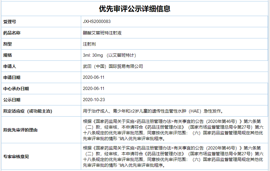 武田于2020年6月11日向NMPA递交醋酸艾替班特注射液上市申请,并于10月23日获CDE拟优先审评。