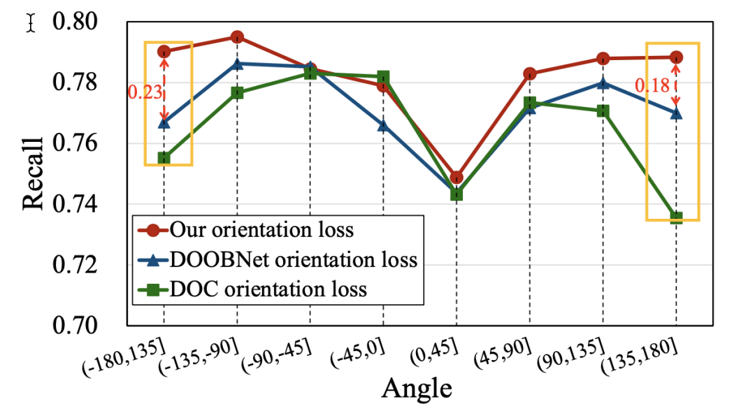 为了证明 OOR 对于角度区间 $(-\pi,\pi]$ 端点值预测的优化,作者分别对三种遮挡方向预测方式的预测结果进行了分角度区间的遮挡方向预测召回率的比较。从下图可以看到,相比于之前最好的 DOOBNet 的遮挡方向预测,本文的方法在两端分别提升了 0.23 和 0.18。这证明了之前采用区间预测方式存在严重的端点值错误的问题,而本文的 OOR 有效地解决了这一问题。