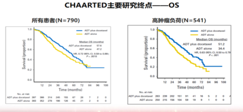 图1、相比单独ADT,ADT联合多西他赛显著提高mHSPC患者总生存(10.4个月),高肿瘤负荷患者生存获益更明显(16.8个月)