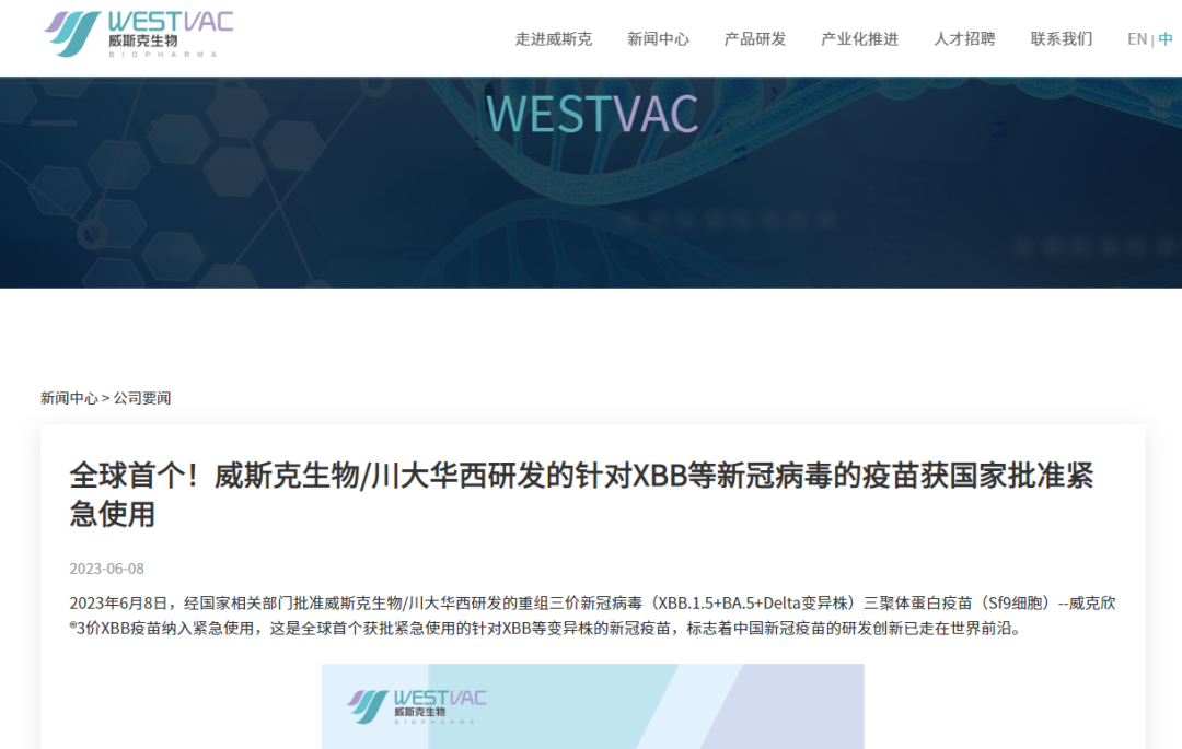 昨日(6月8日),威斯克生物在其官网宣布,其与川大华西研发的重组三价新冠病毒三聚体蛋白疫苗(Sf9细胞)——威克欣3价XBB疫苗获国家批准紧急使用,根据威斯克生物的介绍,该疫苗针对的是XBB.1.5+BA.5+Delta变异株,这也是全球首个获批紧急使用的针对XBB等变异株的新冠疫苗。