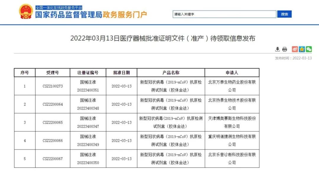 据国家药监局官网信息显示,又有五家企业的新冠抗原产品注册申请获得批准,包括万泰生物、热景生物、天津博奥赛斯生物、重庆明道捷测生物和北京乐普诊断。