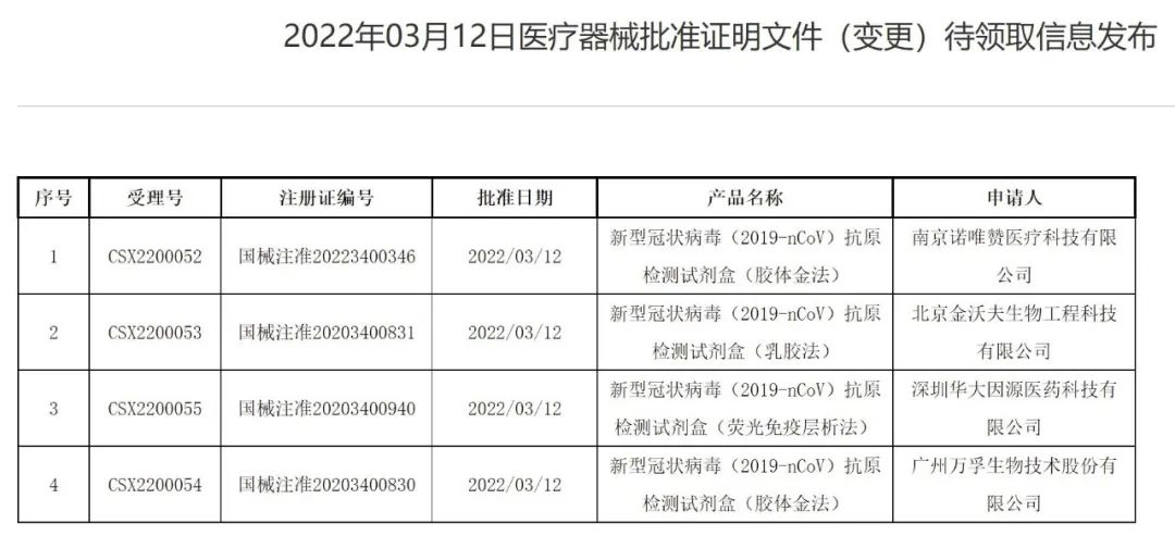随后,国家药监局网站发布的医疗器械批准文件(变更)待领取信息显示,北京华科泰生物技术股份有限公司、南京诺唯赞医疗科技有限公司、北京金沃夫生物工程科技有限公司、深圳华大因源医药科技有限公司、广州万孚生物技术股份有限公司的5款新冠抗原检测试剂盒通过了药监局的注册信息变更。