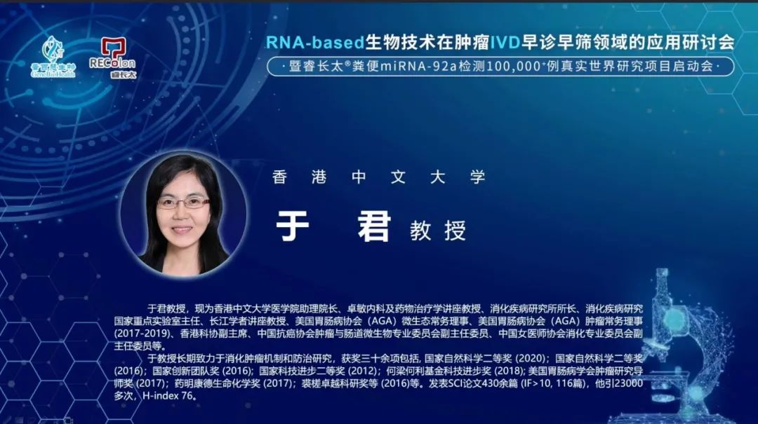 为进一步推动癌症早筛行业规范发展,2021年6月19日,肠癌早筛企业晋百慧生物主办“RNA-based生物技术在肿瘤IVD早诊早筛领域的应用研讨会暨睿长太®粪便miRNA-92a检测100,000+例真实世界研究项目启动会”。会议邀请到了中国人民解放军空军军医大学第一附属医院樊代明院士、香港中文大学医学院助理院长于君教授、上海交通大学附属瑞金医院邹多武主任、南京大学医学院附属鼓楼医院党委副书记邹晓平教授、天津医科大学总医院王邦茂主任、中华医学会游苏宁主任等众多消化道癌症早筛领域的专家和学者。