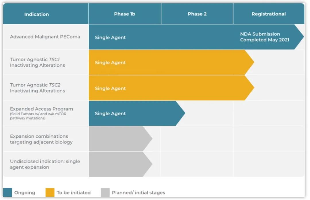 Aadi最初的重点是治疗TSC1或TSC2基因变异患者,TSC1或TSC2基因是肿瘤抑制因子,当其失活时,成为许多不同癌症类型的驱动因素。Aadi的FYARRO晚期恶性PEComa(AMPECT试验)表明显著的临床疗效,这是一种已知TSC1或TSC2基因突变率最高的癌症。根据AMPECT试验、FYARRO在其他具有TSC1或TSC2突变的实体肿瘤中的新数据以及与FDA的讨论,Aadi计划在2021年底前启动一项针对含有TSC1或TSC2失活癌症的tumor-agnostic注册试验。