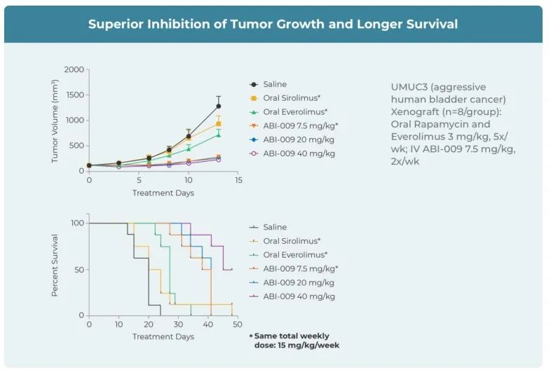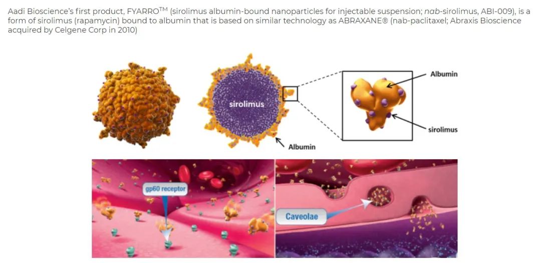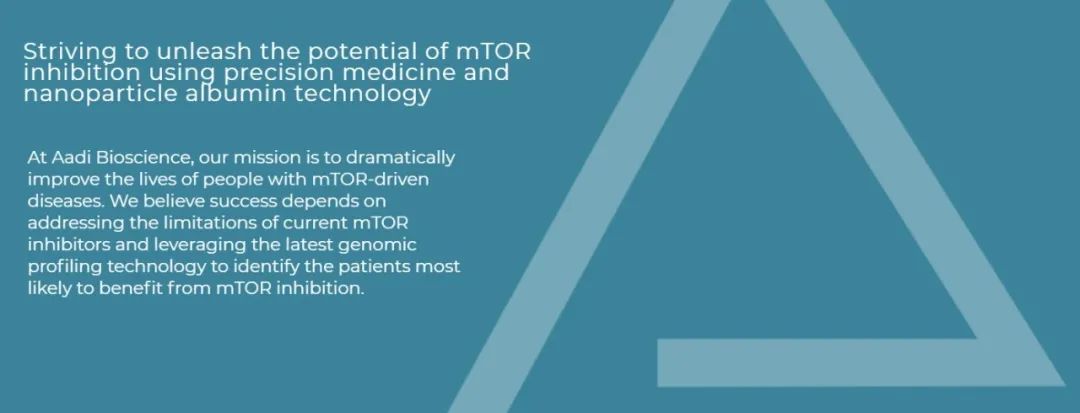 Aadi是一家临床阶段的生物制药公司,开发针对基因定义癌症的精确疗法。Aadi的主要目标是为具有mTOR通路驱动因子改变的癌症患者带来转化结果,而其他mTOR抑制剂由于药理学、有效药物递送、安全性或对疾病部位的有效靶向性等问题尚未或不能有效利用。Aadi的管线FYARROTM(sirolimusalbumin-bound nanoparticles注射悬浮液;nab-sirolimus;ABI-009)是一种与人白蛋白结合的mTOR抑制剂,与临床前模型中的其他mTOR抑制剂相比,有显著肿瘤积聚、mTOR靶向抑制和疗效。