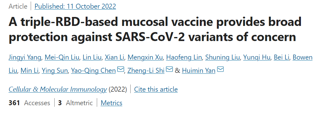 2022年10月11日,国际著名学术期刊《Cellular & Molecular Immunology》报道了我国多团队合作研发出的一种广谱高效的新冠亚单位滴鼻黏膜疫苗。这项研究的创新之处在于:
