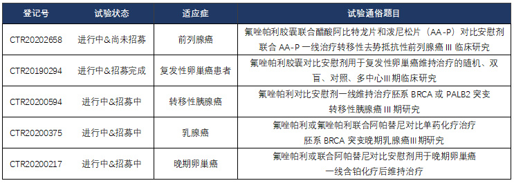 基于合成致死作用机制的显著疗效,PARP抑制剂已在多个癌种获批适应症。目前FDA已批准4款PARP抑制剂,包括奥拉帕利(Olaparib,阿斯利康,2014 FDA获批,2018国内获批),尼拉帕利(Niraparib,GSK,2017 FDA获批,2019国内获批),卢卡帕利(Rucaparib,ClovisOncology,2016 FDA获批),他拉唑帕利(Talazoparib,辉瑞,2018 FDA获批),主要适应症覆盖卵巢癌、乳腺癌、胰腺癌、前列腺癌,目前针对肾细胞癌、胃癌、肺癌等多个癌种的临床研究也在进行中。2020年12月,国产首个PARP抑制剂恒瑞医药的氟唑帕利胶囊(商品名:艾瑞颐)获批上市,用于既往经过二线及以上化疗的伴有胚系BRCA突变(gBRCAm)的铂敏感复发性卵巢癌、输卵管癌或原发性腹膜癌患者的治疗。该适应症的获批是基于一项由中国医学科学院肿瘤医院吴令英教授担任主要研究者,全国26家研究机构共同参与的氟唑帕利治疗BRCA1/2突变的复发性卵巢癌的单臂、多中心Ⅰb期临床研究,研究结果近期已于国际著名医学期刊《临床癌症研究》(Clin Cancer Res)上在线全文发表。该研究评估了氟唑帕利单药在BRCA1/2突变的复发性卵巢癌中的疗效和安全性,在113例疗效可评估的患者中,客观缓解率(ORR)高达69.9%,中位缓解时间(mDoR)长达10.2个月,中位无进展生存期(mPFS)长达12.0个月,疗效显著。同时,氟唑帕利也显示出良好的安全性,血液学毒性与同类产品相当,3级胃肠道反应较同类药发生率更低。