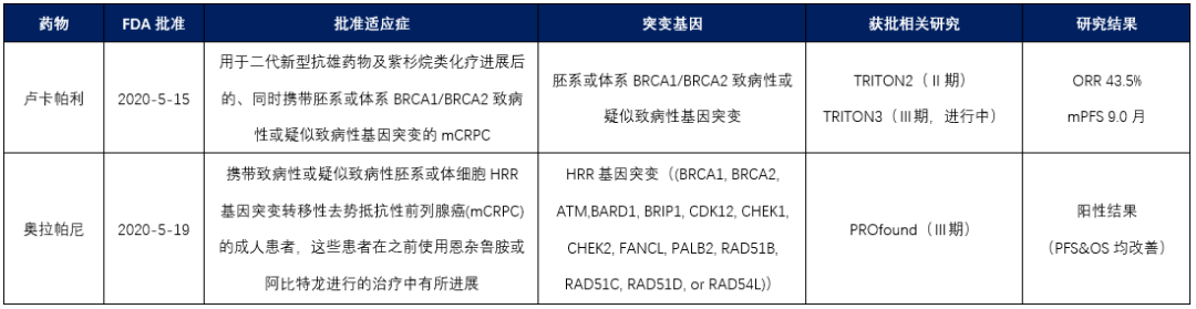mCRPC患者中约20%~30%的患者发生同源重组修复(HRR)基因突变,最常见的突变基因为BRCA1/BRCA2和ATM,因此各药企也均在前列腺癌领域开展了多项PARP抑制剂研究。目前已有两款PARP抑制剂药物获得FDA批准用于前列腺癌治疗。2020年5月,FDA有条件快速批准(Accelerated Approval)卢卡帕利用于二代新型抗雄药物及紫杉烷类化疗进展后的、同时携带胚系或体系BRCA1/BRCA2致病性或疑似致病性基因突变的mCRPC。该适应症的获批是基于TRITON2(NCT02952534),一项开放、单臂的Ⅱ期临床研究,显著的ORR(43.5% ,95% CI, 31.0%-56.7%)及mPFS(9.0月,95% CI, 8.3月-13.5月)结果。该适应症的完全批准(Full Approval)将有赖于卢卡帕利TRITON3(NCT02975934)研究的结果。TRITON3是一项多中心、随机、开放Ⅲ期临床研究,旨在评价卢卡帕利单药对比研究者选择的治疗方案(阿比特龙、恩扎卢胺或多西他赛)治疗既往接受过新型抗雄药物但没接受过化疗、且同时携带胚系或体系BRCA1/ BRCA2或ATM基因突变的mCRPC的疗效与安全性,主要终点为PFS,该研究正在进行中尚未出结果。仅4天后,FDA再次宣布批准奥拉帕利用于恩扎卢胺或阿比特龙治疗进展后的、同时携带胚系或体系同源重组修复(HRR)致病性或疑似致病性基因突变的mCRPC。值得注意的是,该适应症将获批人群扩大至14种HRR基因突变类型,包括BRCA1, BRCA2, ATM, BARD1, BRIP1, CDK12, CHEK1, CHEK2, FANCL, PALB2, RAD51B, RAD51C, RAD51D, 或RAD54L。该适应症的获批是基于PROfound研究阳性试验结果。PROfound是一项多中心、开放、随机、对照Ⅲ期临床研究,旨在评价奥拉帕利单药对比研究者选择的治疗方案(阿比特龙或恩扎卢胺)治疗既往接受过新型抗雄药物且至多一线紫杉烷类化疗、且同时携带指定HRR基因突变mCRPC。该研究根据基因突变类型,将受试者分为队列A(BRCA1/2或ATM突变)和队列B(至少携带其他12个指定基因中的一个突变),主要研究终点为第三方独立影像中心(IRC)评估的队列A的mPFS。研究结果表明队列A中奥拉帕利单药mPFS显著优于对照组(7.4月vs 3.6月,HR, 0.34; 95% CI, 0.25-0.47; P <0.001),队列A+B中奥拉帕利单药mPFS也显著优于对照组(5.8月vs 3.5月,HR, 0.49; 95% CI, 0.38-0.63; P <0.001)。同时OS数据也显示出优势,队列A中奥拉帕利单药mOS优于对照组(19.1月vs 14.7月,HR, 0.69; 95%CI, 0.50-0.97; P =0.0175),队列A+B中奥拉帕利单药mOS也优于对照组(17.5月vs 14.3月,HR, 0.67)。
