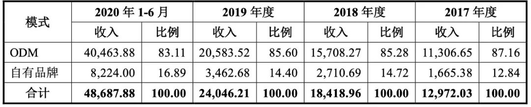 另一方面,行业地位从公司的业务模式亦可见一斑,在业已公告的三年一期收入结构里,ODM(贴牌代工)占比常年在85%左右,自有品牌占比仅15%。