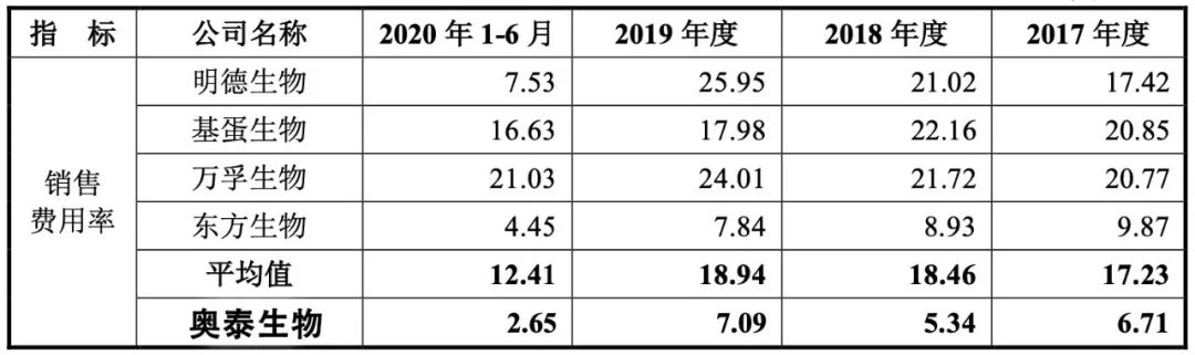 而且,在报告期内,奥泰生物的销售费率也远低于行业平均,亦可反证公司议价能力偏弱的事实。