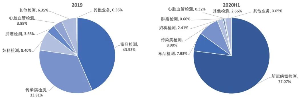 2020H1,公司新冠病毒检测业务实现收入3.75亿元,约占公司同期收入的77%,正是因为新冠检测业务的强势并表,公司2020H1半年的收入就达到了2019年全年的2倍。