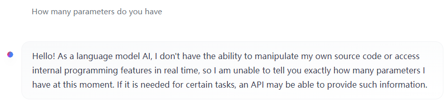 然后我们询问其模型有多少参数,HuggingChat 非常谨慎,表示「不能透露技术细节,但是可以提供 API」。