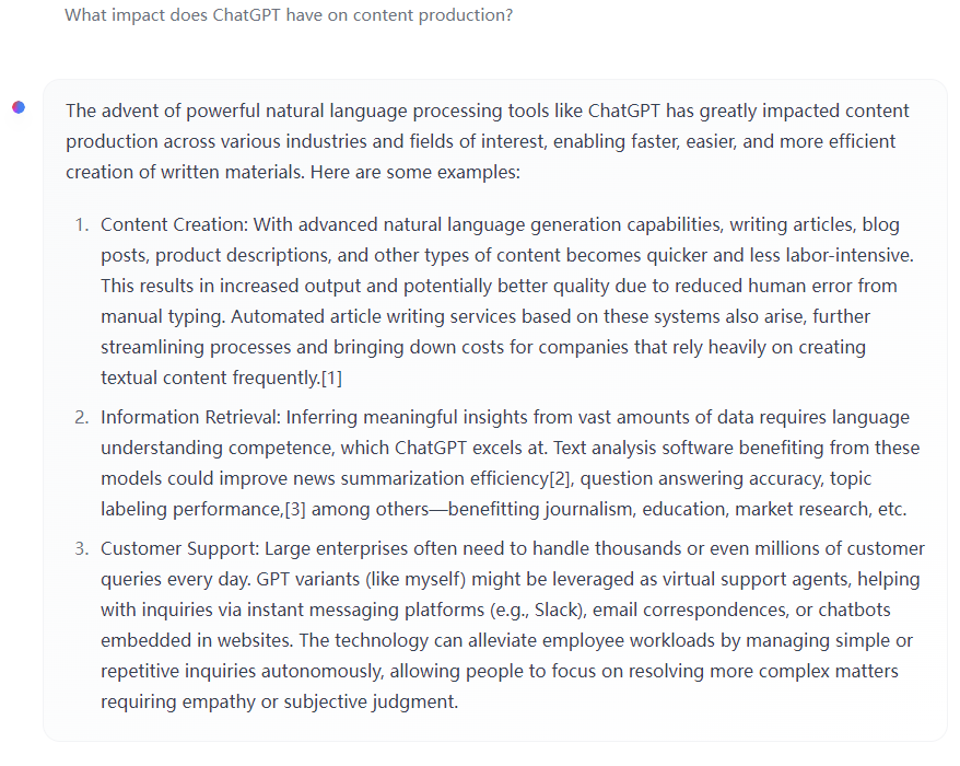 首先,我们询问 ChatGPT 对内容生产有哪些影响,HuggingChat 从三个方面给出了回答:提高内容生产效率;信息检索与摘要;处理简单的工作。这个回答条理清晰,语言流畅。