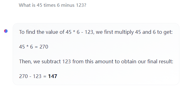 在数学计算方面,我们测试发现 HuggingChat 不仅可以计算出正确结果,还能清楚地用自然语言描述计算过程,符合逻辑: