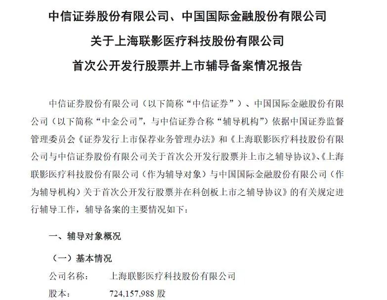 据上交所官网信息,日前上海联影医疗科技股份有限公司(以下简称“联影医疗”)已与中信证券、中金公司签署辅导协议,正式启动科创板上市流程。
