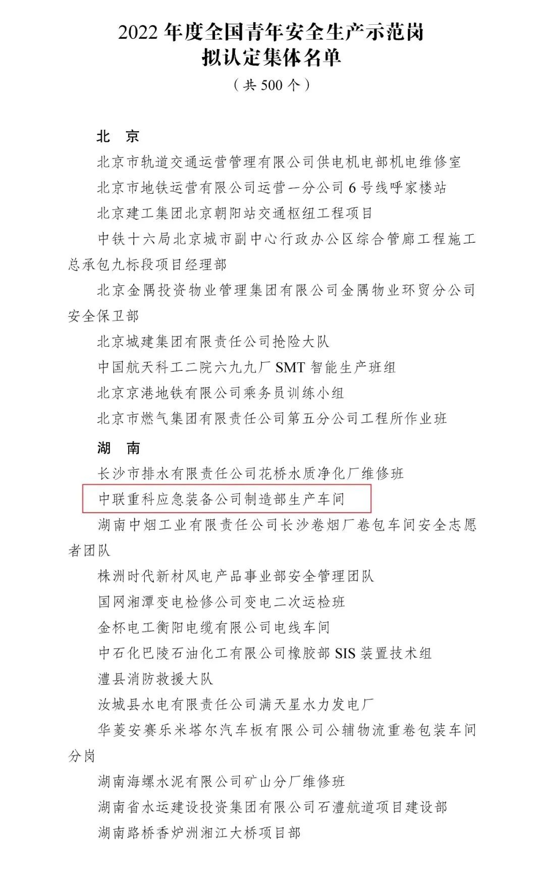 《2022年度全国青年安全生产示范岗拟认定集体名单》日前公布,中联重科应急装备公司制造部生产车间入选2022年度全国青年安全生产示范岗认定集体名单。