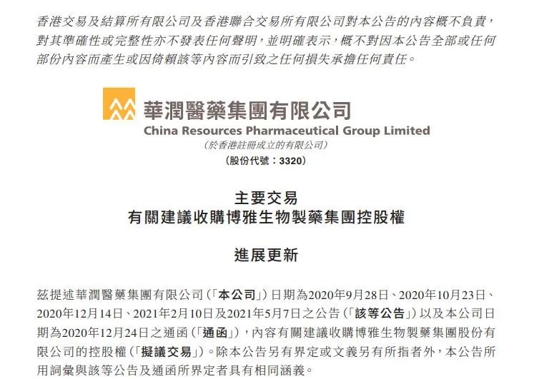 昨日(7月6日),华润医药发布有关建议收购博雅生物制药集团控股权进展更新的公告。