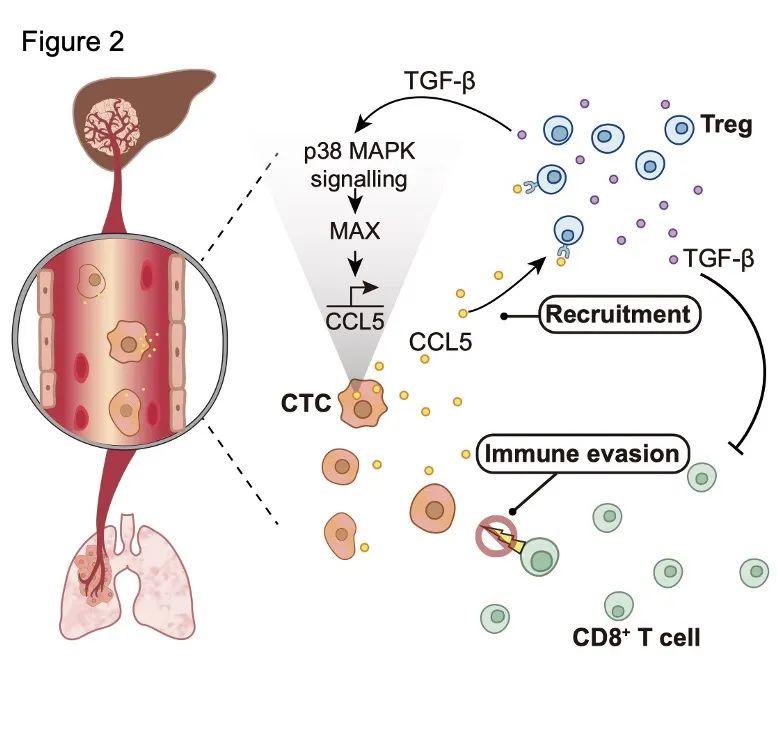 综上所述,本项发表在Nature Communications的研究,首次从单细胞转录组层面证实了CTC在体内循环过程中的时空异质性;系统揭示了CTC动态调控相关信号通路以适应循环过程中所面临的各种环境压力;阐明了CTC通过活化p38-MAX信号通路诱导CCL5表达,进而招募Treg实现免疫逃逸的相关分子机制(图2)。本研究结果为进一步探索靶向CTC的抗肿瘤复发转移策略提供了新思路。