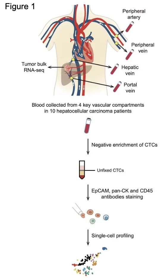 为了全面剖析CTC在整个循环播散时空过程中的特征变化及其背后的分子机制,作者决定对体内不同血管部位的CTC进行单细胞层面的深入研究。肝癌细胞从肝内原发灶脱落首先会经过肝静脉(hepatic vein, HV)释放进入下腔静脉,然后随血流进入心脏,再通过肺循环以后,CTC进入外周动脉(Peripheral artery, PA),经过外周毛细血管网,CTC流入外周静脉(Peripheral vein, PV),门静脉(Portal vein, PoV)则收集来自消化系统的静脉血再次流入肝脏。本研究共入组10例原发性肝癌行根治性切除手术的病人,在切除肿瘤之前,采集CTC从原发灶播散开始沿着循环路径上的这四个关键血管部位的血液,即肝静脉(HV)、外周动脉(PA)、外周静脉(PV)和门静脉(PoV)。将CTC阴性富集后,再通过单细胞操控机器人把单个未固定的CTC挑选出来,共成功分离295个CTC单细胞,进行单细胞全长转录组测序,完成转录组测序后(scRNA-seq)共获得113个质控合格的CTC单细胞转录组数据进行下游生物信息分析(图1)。