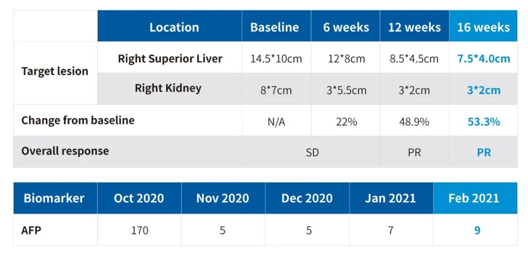 该项临床研究中的这位患者在入组前已接受过索拉菲尼、仑伐替尼等标准方案的治疗,并参加过PD-1抗体的临床研究。在接受HBM4003治疗6周后,患者被评估为“疾病稳定(SD,stable disease)”、靶病变缩小22%;12周后患者进入“部分缓解(PR,partial response)”阶段,靶病变缩小48.9%;16周之后靶病变缩小53.3%,24周后靶病变缩小超过60%。此外,经研究者确认,24周后,患者的肺转移、淋巴结转移、左肝转移等非靶病灶全部消失,判定为非靶病灶“完全缓解(CR, complete response)”,靶病灶“部分缓解(PR,partial response)”。患者距离末次给药接近5个月,展示出非常亮眼的中长期药效。