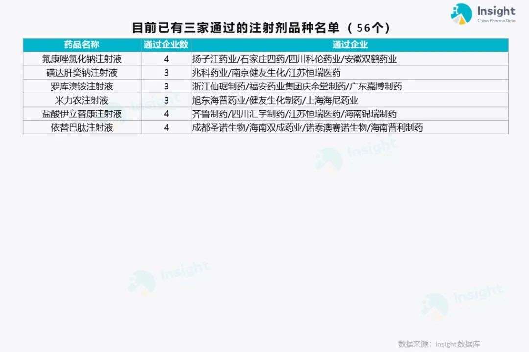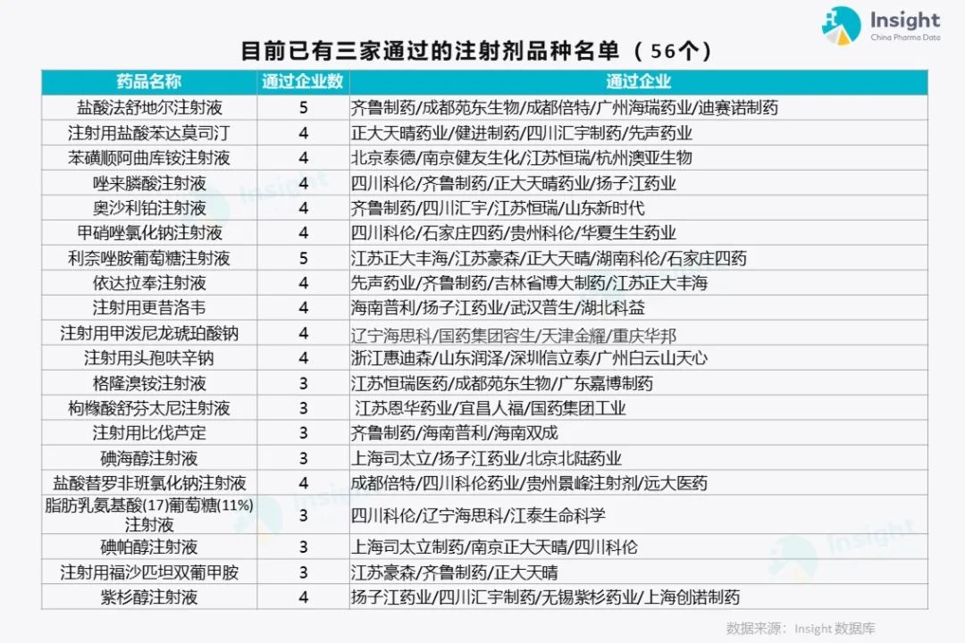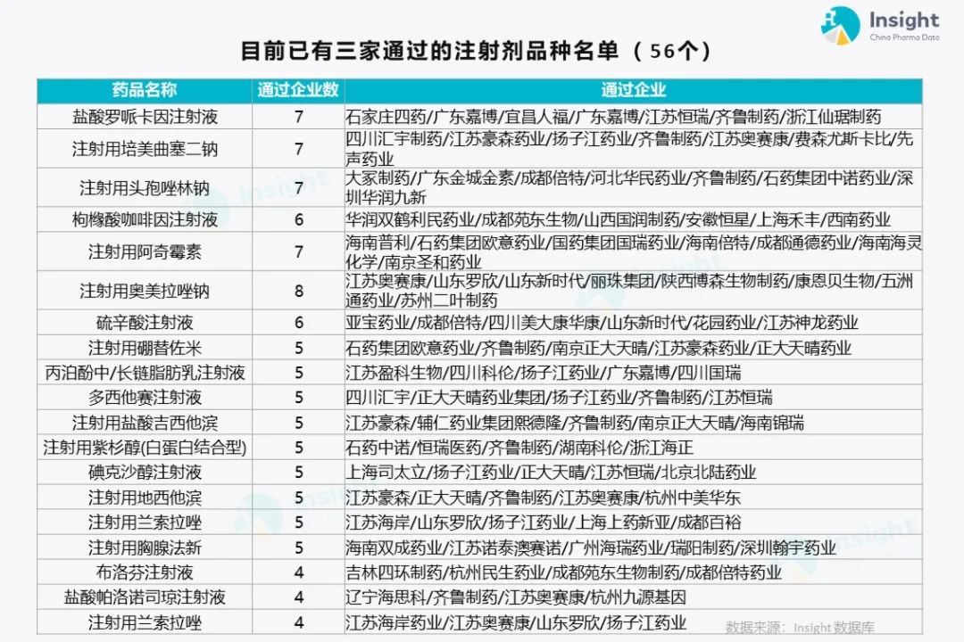 Insight 数据库(https://db.dxy.cn)统计,一致性评价品种通过企业达 3 家的品种已经有 236 个,其中注射剂品种 56 个。