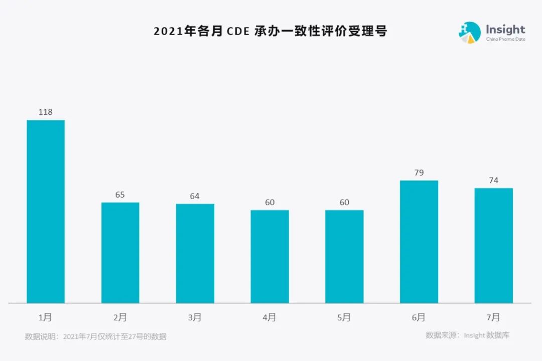 截止 2021 年 7 月 27 号, 7 月份 CDE 承办了 74 个新申报的一致性评价受理号。