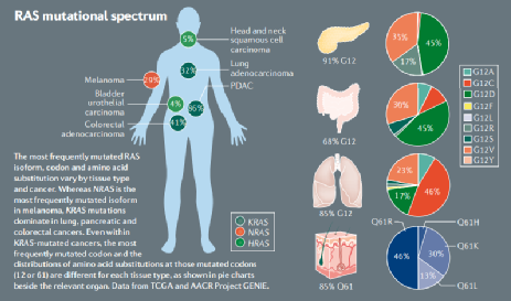 是肿瘤患者中最常见的致癌基因之一,目前包括KRAS、NRAS以及HRAS三种亚型。其中,NRAS突变多见于黑色素瘤和急性骨髓性白血病,HRAS突变多见于膀胱癌和头颈癌,而KRAS突变比其他两种更常见,最常发生在肺癌、胰腺癌以及结直肠癌中,也成为了科学家们着力攻克的热点。RAS曾被医学界称为“不可成药靶点”,科学家们在研究有效的RAS抑制剂方面已经摸索尝试了超过30年,直至近几年才获得了重大突破。