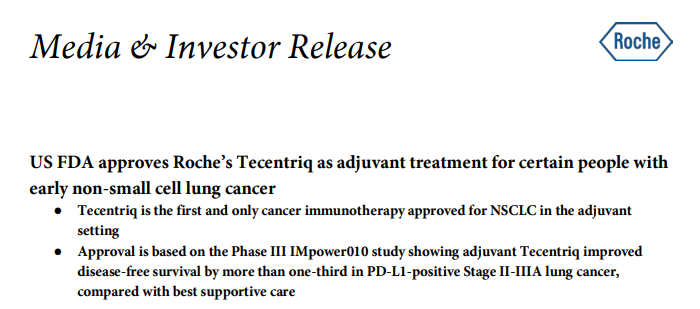 10 月 15 日,罗氏宣布阿替利珠单抗(atezolizumab,Tecentriq®)用于肿瘤表达 PD-L1 ≥ 1% 的 II-IIIA 期 NSCLC 成人患者手术和铂类化疗后的辅助治疗适应症已获 FDA 批准。本次获批后,Tecentriq 成为首个也是唯一一个被批准用于 NSCLC 辅助治疗的肿瘤免疫疗法。