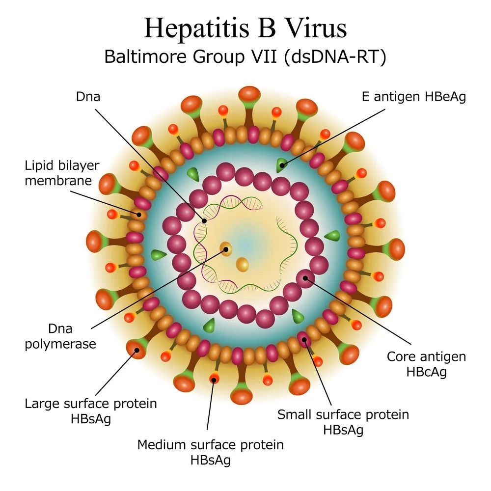 乙型肝炎病毒(hepatitis B virus,HBV)是引起乙型肝炎的病原体,属嗜肝DNA病毒科,即寄居在肝脏中。它有三种形态:大球形颗粒(直径42nm)、小球形颗粒(直径22nm)和管形颗粒(直径22nm)。它由包膜和核心两部分组成,包膜即表面抗原(HBsAg),核心部分有核心抗原(HBcAg)、e抗原(HBeAg)、HBV-DNA以及DNA多聚酶。其中e抗原属于非结构蛋白,合成后经内质网分泌至肝细胞外,参与病毒的复制,而核心抗原和DNA常存在于肝细胞内。