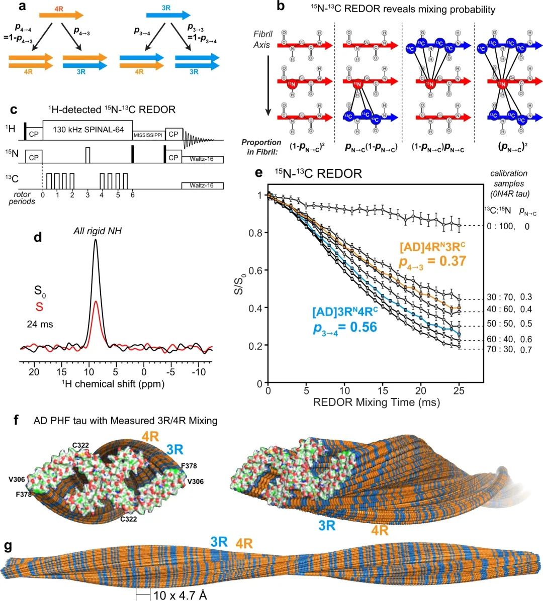既然神经原纤维缠结是由 3R 或 4R tau 蛋白组成,那两类 tau 蛋白在分子水平结合形成缠结的具体机制是怎么样的呢?对此,Mei Hong 团队提出猜想:这种缠结可能是由大量 3R 和 4R tau 蛋白以单个分子交替的形式结合而成。