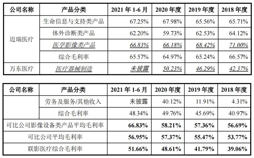同时,迈瑞医疗和万东医疗两家可比上市公司主营业务均为医疗器械的研发、生产与销售,与联影医疗具有一定的可比性。迈瑞医疗的医学影像类产品主要为超声诊断系统、数字 X 射线成像系统和 PACS,万东医疗的医学影像类产品主要为 DR 产品、MR 产品、DSA 产品、数字胃肠产品以及 CT 产品。联影医疗报告期内毛利率与万东医疗较为接近,由于细分产品不同,毛利率低于迈瑞医疗,但总体符合行业水平。