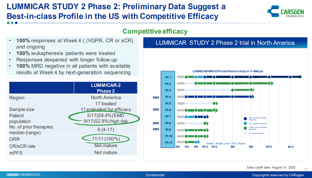 截至2022年9月21日,II期研究中共17例患者入组。结果显示,在11例(至少随访8周)可评估的患者中,客观缓解率达到100%(非常好的部分缓解、完全缓解或严格完全缓解),并在更长的随访期内观察到缓解加深。此外,所有的MRD阳性患者转为阴性。