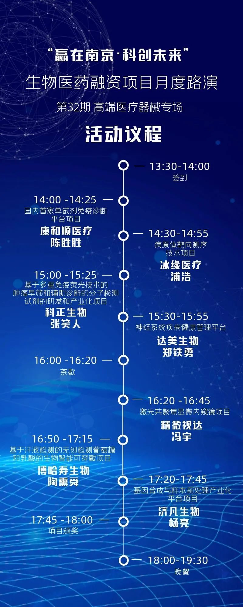 每期优选生物医药创业明星企业,为新锐创业者搭建与专业投资机构、产业资本之间高峰对话交流的平台;促进企业家、创业新锐、专业投资机构、临床/科研/法规专家等高峰人士畅通对话和常态联动;加速优质创新项目融资和成果产业化,助力生物医药创新生态链上的各领域人士实现互利共赢、共同发展。