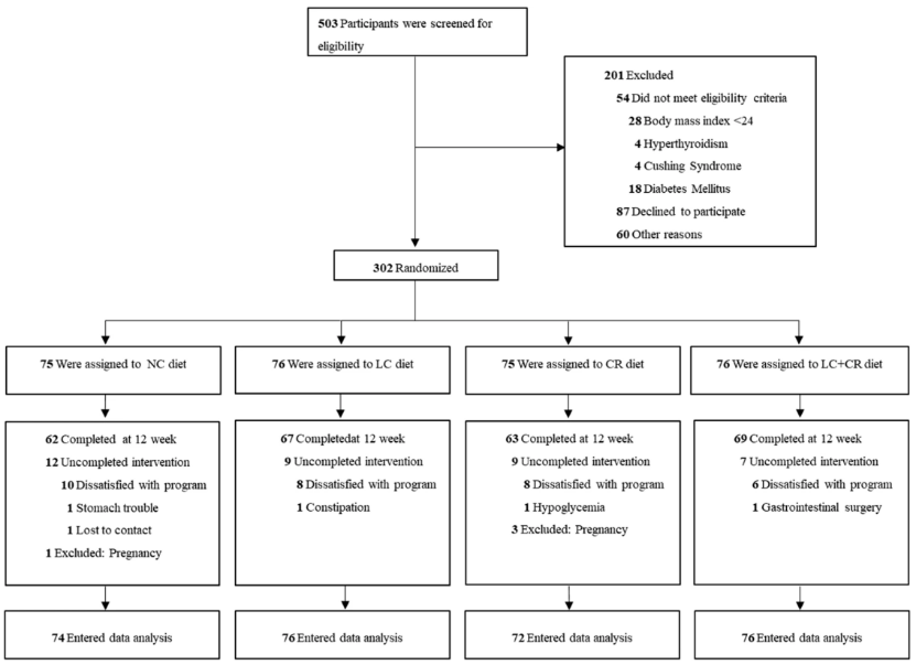 受试者均采用随机入组原则,以 1:1:1:1 的比例,随机分配到不限制能量摄入的正常饮食对照(normal control diet, NC)组、限制热量(calorie-restricteddiet, CR)组、低碳水化合物(low-carbohydrate diet, LC)、限制碳水化合物和热量(LC + CR diet)组。