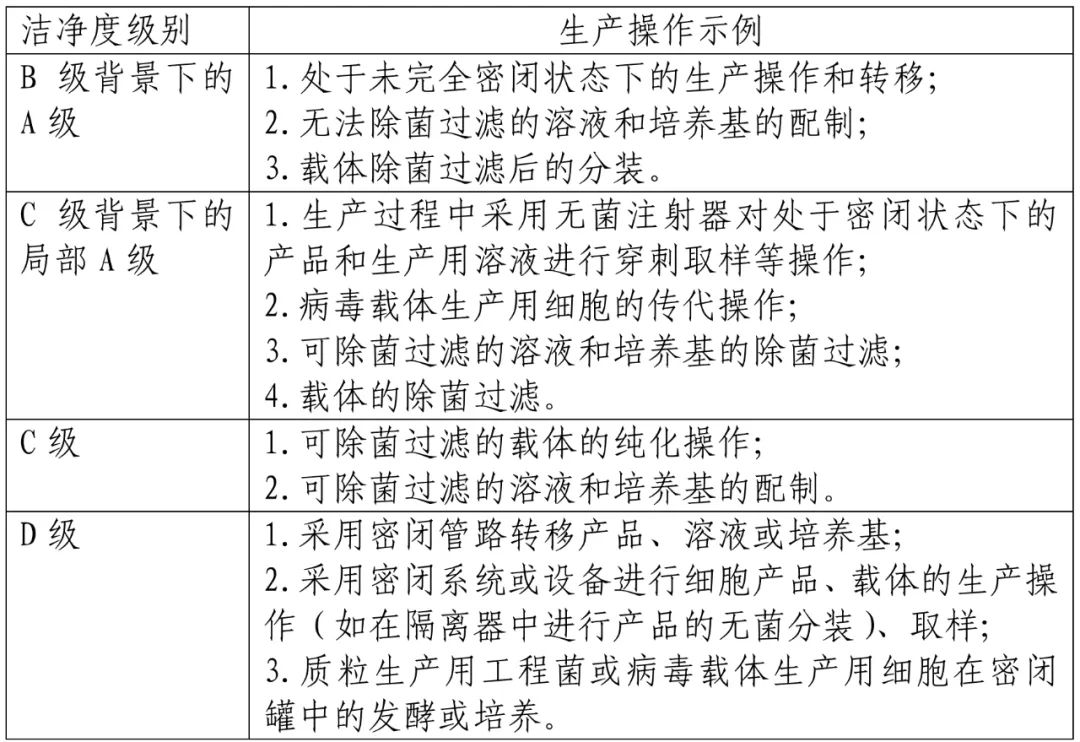 (四)细胞产品、直接用于细胞产品生产的基因修饰载体或其他赋予其特定功能的材料,其生产操作环境的洁净度级别可参照表格中的示例进行选择。
