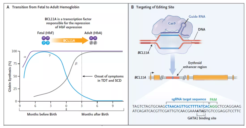 ▲Exa-cel的作用机制:A,BCL11A是下调胎儿血红蛋白表达的转录因子;B,exa-cel通过对BCL11A进行基因编辑,上调胎儿血红蛋白的表达(图片来源:参考资料[3])