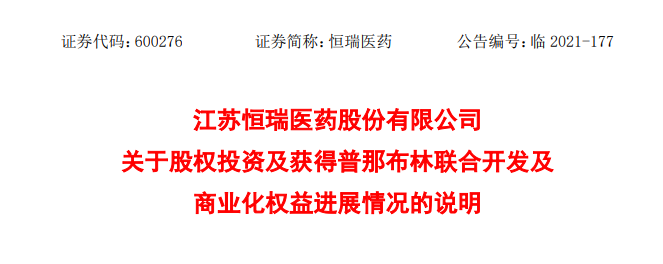 8 月 26 日,恒瑞医药发布重磅交易,以 13 亿元与万春达成合作,获得普那布林产品,以与自身产品线产品联用互补。