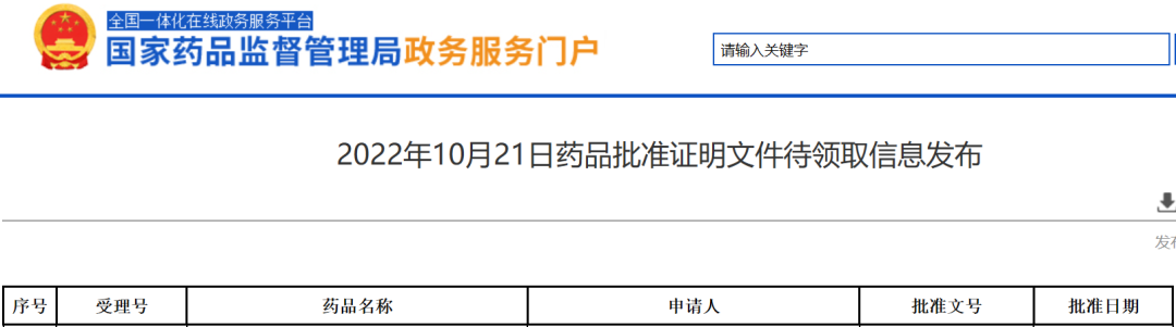 [1]2022年10月21日药品批准证明文件待领取信息发布 . Retrieved Oct 21,2022, from https://www.nmpa.gov.cn/zwfw/sdxx/sdxxyp/yppjfb/20221021083345155.html