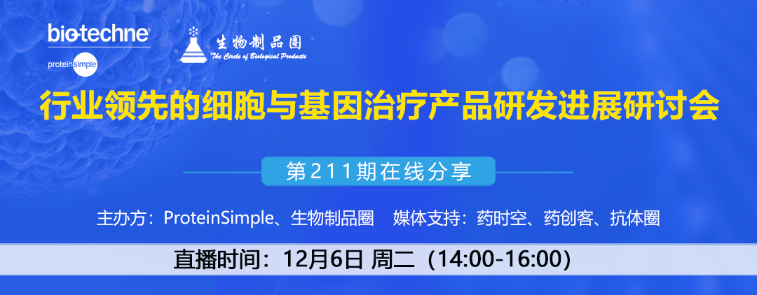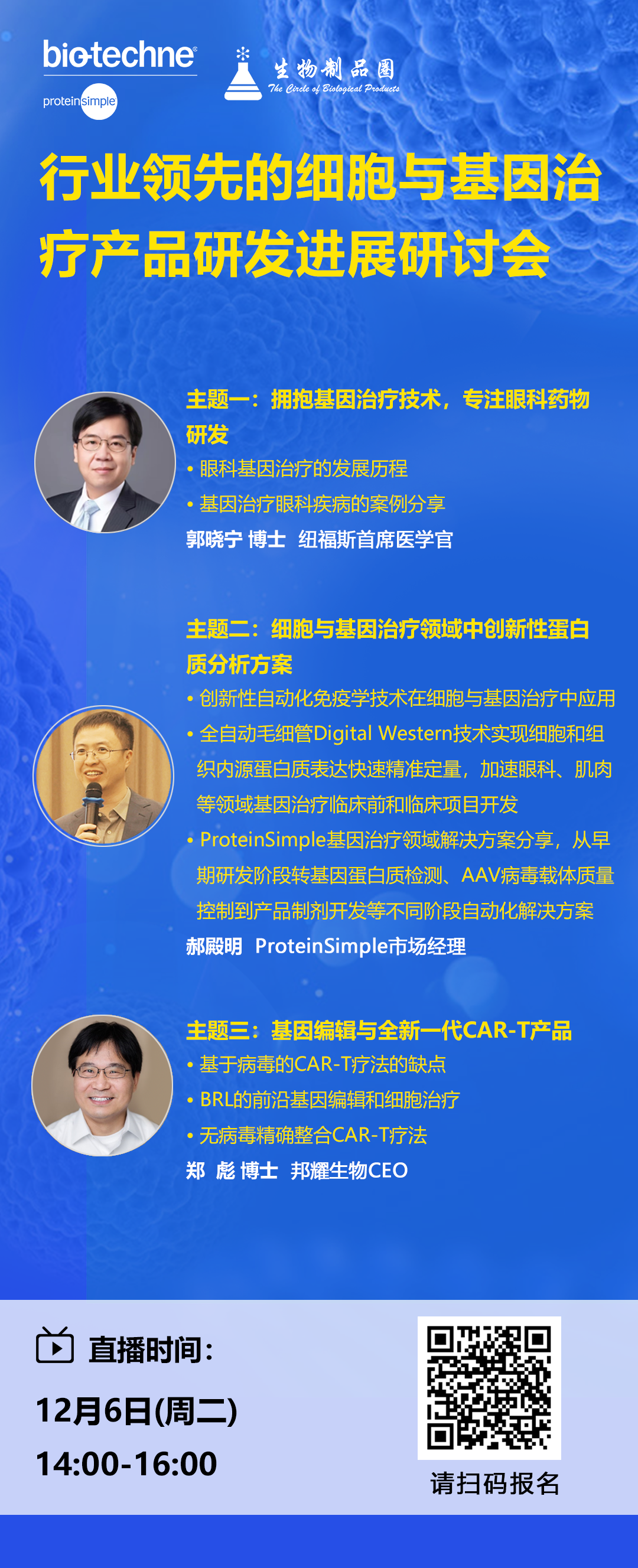 为了帮助大家在细胞和基因治疗工艺开发及基因编辑技术中的各种疑惑,生物制品圈携手ProteinSimple2022年12月6日(周二)14:00-16:00在线上分享细胞和基因治疗研究进展及应用相关主题。