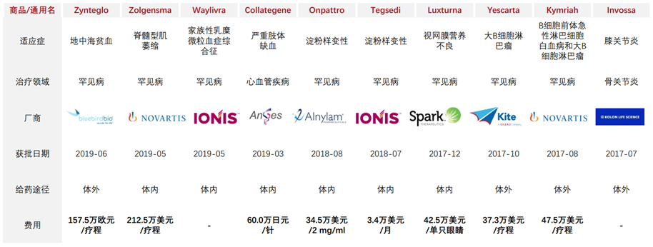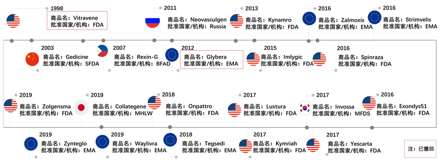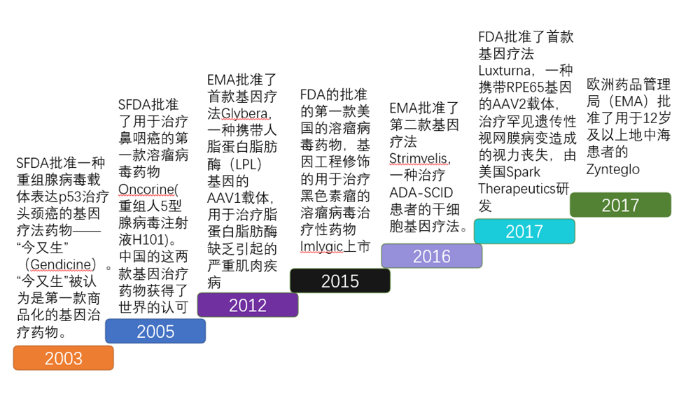 2003年国家食品药品监督管理局(SFDA)批准一种重组腺病毒载体表达p53治疗头颈癌的基因疗法药物——Gendicine,被认为是第一款商品化的基因治疗药物。2005年SFDA批准用于治疗鼻咽癌的第一款溶瘤病毒药物Oncorine(重组人5型腺病毒注射液H101)。此后数年内欧美和中国都无基因治疗产品获批,直至2012年EMA批准首款基因疗法Glybera,开启基因治疗的“元年”。