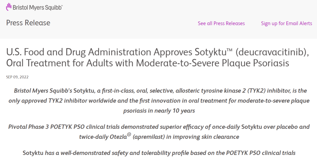 2022年9月9日,百时美施贵宝宣布FDA批准其Tyk2抑制剂Deucractinib上市,用于治疗成年中至重度斑块型银屑病患者,商品名为Sotyktu,名字中Tyktu即意为Tyk2(可以简单理解为:所以就用tyk2吧)。