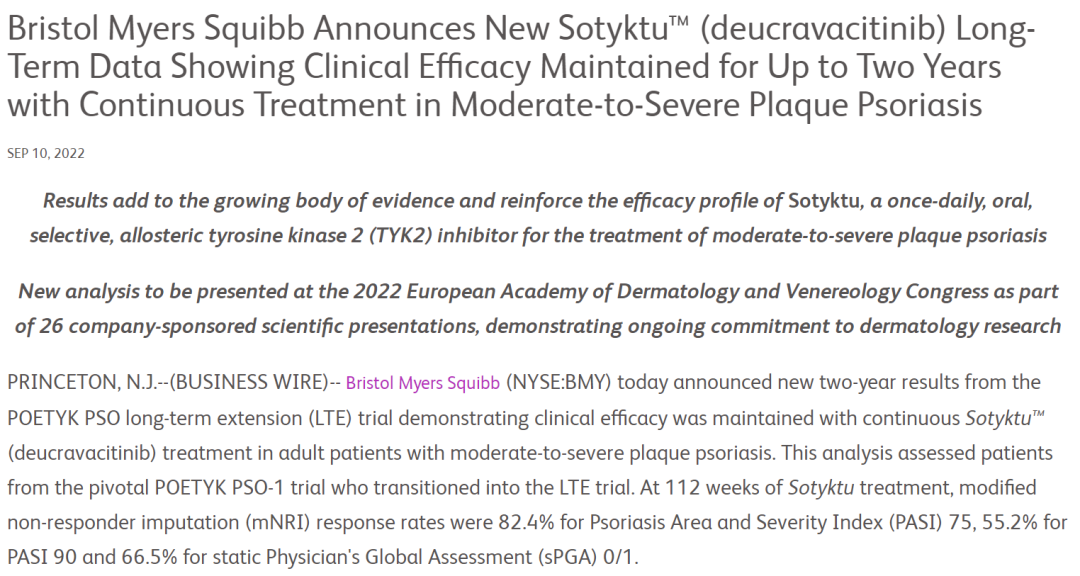 9月10日,百时美施贵宝公布了Sotyktu治疗中至重度银屑病的长期随访疗效数据,经过112周治疗,PASI75的mNRI响应率为82.4%,PASI90的响应率为55.2%,sPGA0/1的比例为66.5%。