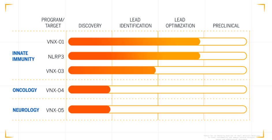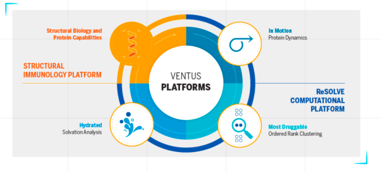 Ventus公司由知名风险投资机构Versant Ventures孵化,旨在开发靶向先天免疫系统的小分子药物,治疗自身免疫性疾病,炎性疾病和癌症。该公司的药物发现平台将计算机技术与领先的结构生物学、蛋白质工程、生物物理学和生物化学相结合,拥有两个专有平台:Structural Immunology和ReSOLVE。具体来说,Structural Immunology平台基于蛋白工程学,能够表达和生成稳定的单体靶点蛋白(包括炎性小体和核酸感应中的靶点蛋白);这有助于解析这些蛋白的结构,并基于结构发现新的药物。ReSOLVE平台针对传统上认为“不可成药”靶点,可将在研管线扩展到肿瘤学和神经病学疾病领域。