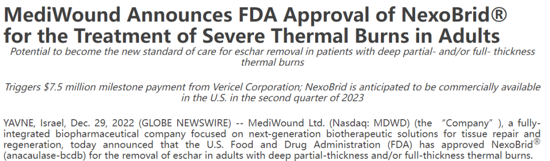 2022年12月29日,MediWound宣布FDA批准NexoBrid(anacaulase-bcdb)上市,用于移除有深度部分皮层烧伤和/或全皮层烧伤的成人患者身上的焦痂。